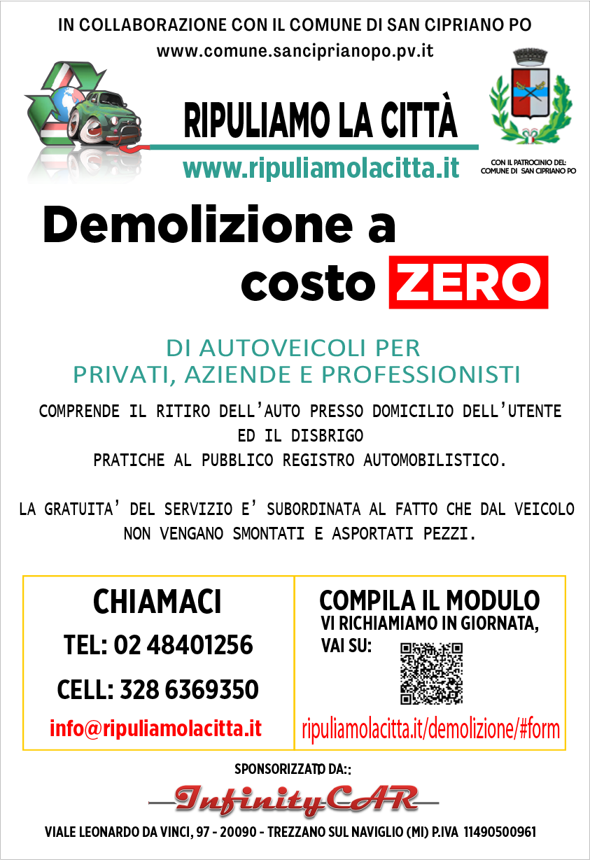 Il progetto offre la demolizione di veicoli con ritiro a domicilio e assistenza burocratica come da convenzione approvata tra Comune e la società Infinity Car con deliberazione di G.C. n. 54 del 17.10.2023.